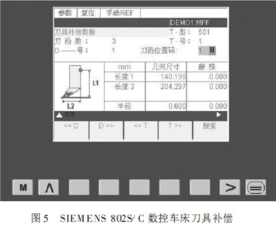 在SIEMENS 數(shù)控系統(tǒng)中,使用 Txx 調(diào)用刀具,其刀具補償號由 Dx x 指令指定,其后的數(shù)字表示刀具偏置存儲器號。例如 T01 D01 ,如圖5所示,對應(yīng)刀具位置補償中,長度 1 就是X 軸方向的補償,長度2 就是Z 軸方向的補償,刀具圓弧半徑補償值 R 填在半徑存儲器里。與 FANUC系統(tǒng)相同,其中一般將對刀結(jié)果存儲在長度對應(yīng)的幾何尺寸中,而長度對應(yīng)的損存儲器一般用于輸入切削余量和修正對刀結(jié)果以及由于刀具磨損形成的零件加工誤差。在自動執(zhí)行過程中,數(shù)控系統(tǒng)調(diào)用該存儲器中的長度1 、長度2 、半徑的幾何尺寸和磨損值疊加的數(shù)值,自動修正刀具的位置誤差和自動進行刀尖圓弧半徑補償[ 3 ]。
