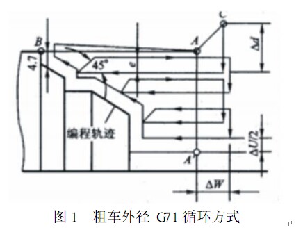 外徑粗車固定循環 G71 主要用于內、 外階梯軸的粗車,毛坯一般為棒料。如圖 1 所示為粗車外徑的加工路徑。圖中 C是粗加工外徑的起點 ,A 是毛坯外徑與端面輪廓的交點。只要在程序中 ,給出 A→A/ → B 之間的精加工形狀及徑向精車余量ΔU/