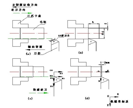 工件坐標系的建立有兩種方法: 一為使用對刀儀的方法, 二為試切對刀法. 實踐中試切法具有簡單, 經濟的特點, 本文即介紹試切法建立單把車刀的工件坐標系的過程, 具體步驟如下: