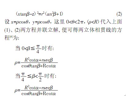在我們的生活和生產(chǎn)中, 常常會(huì)遇到兩個(gè)或若干個(gè)立體相交的問(wèn)題(在畫法幾何中, 我們稱之為相貫), 比如在機(jī)械生產(chǎn) 化工設(shè)備 運(yùn)輸管道 鋼結(jié)構(gòu)構(gòu)件的連接中, 通常會(huì)遇到一些平面與曲面立體之間的截交以及曲面立體曲面立體之間的相貫問(wèn)題. 而通常我們只用作圖法來(lái)求, 作圖法雖然形象直觀 迅速, 但卻由于受到作圖操作和儀器工具的限制, 再加之作圖過(guò)程繁頊 圖形繪制不準(zhǔn)確, 往往給生產(chǎn)制作造成許多麻煩, 且精度更不能滿足現(xiàn)代技術(shù)與計(jì)算機(jī)輔助設(shè)計(jì)和數(shù)控制造技術(shù)的要求, 因此這我們采用圖解與計(jì)算相結(jié)合的方法, 通過(guò)投影圖上的幾何關(guān)系, 再利用解析方法, 建立相貫線上點(diǎn)的坐標(biāo)方程或極坐標(biāo)方程. 并根據(jù)所求的坐標(biāo)方程或極坐標(biāo)方程, 在數(shù)控機(jī)床上利用切割工具, 切割出我們所需的各種相貫曲線. 為此建立相貫線上的點(diǎn)的坐標(biāo)方程或極坐標(biāo)方程是非常重要的.