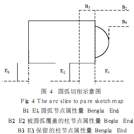 為了得到連續(xù)、動(dòng)態(tài)的切削效果,屏幕畫面必須不斷刷新. 由于是可旋轉(zhuǎn)的三維圖像,每次刷新時(shí)僅將切削處重畫是不行的,必須將整根軸重畫.但如果將整根軸完全重畫,計(jì)算量大、耗時(shí)長(zhǎng)、效率低,為此,利用了顯示表對(duì)切削過程的模擬進(jìn)行優(yōu)化. 在上面提到的軸節(jié)點(diǎn)中,有一G l u n i t 類型屬性量i n d e x ,即是該節(jié)點(diǎn)的顯示表. 這樣,該節(jié)軸在沒有變化之前,程序里實(shí)際上只畫了一次,即將繪圖命令執(zhí)行結(jié)果存儲(chǔ)在緩存中,以后每次顯示時(shí)只需執(zhí)行g l C a l l L i s t ( i n d e x ) 即可. 由于采用了面向?qū)ο蟮牧斜斫Y(jié)構(gòu),整根軸的顯示可以轉(zhuǎn)化為列表的遍歷,依次調(diào)用每個(gè)節(jié)點(diǎn)的顯示表,迅速完成圖形顯示. 而且,復(fù)雜的切削過程也轉(zhuǎn)化為對(duì)列表和各個(gè)節(jié)點(diǎn)的操作,如在某段柱體上切削圓弧只需在柱節(jié)點(diǎn)前插入一圓弧節(jié)點(diǎn),同時(shí)將原柱體分為 2段, 1個(gè)節(jié)點(diǎn)分為 2個(gè),前面的節(jié)點(diǎn)代表圓弧未曾涉及的部分,長(zhǎng)度由 B3到E3( 如圖 4所示) .