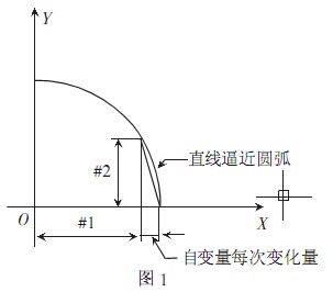 解決方案 1:根據(jù)圓的標準方程 X2+Y2=R 2,上述方程中,X和Y之間存在一定的數(shù)學(xué)關(guān)系,所以我們在數(shù)控程序中可以把其中一個設(shè)為自變量#1,另外一個設(shè)為應(yīng)變量 #2,用含 #1 的表達式表達出 #2,隨著 #1 的變化, #2 隨之變化,這樣就產(chǎn)生了無數(shù)個點的坐標(#1, #2),然后把這無數(shù)個點用直線指令 G01 逼近即為圓弧輪廓,如圖 1