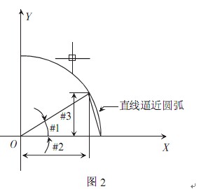 解決方案 2:根據(jù)圓的參數(shù)方程X=acos0,Y=bsin0(R是常量,為圓的半徑)上述方程中X和Y均與其中一個角度0存在一定關(guān)系,在數(shù)控程序中可以把0作為一個自變量 #1,X和Y則相應(yīng)設(shè)為應(yīng)變量 #2和#3,用含#1的關(guān)系式表達出#2和#3,這樣就產(chǎn)生了無數(shù)個點的坐標(#2, #3),然后用無數(shù)個點用直線指令G01 逼近即為圓弧輪廓,如圖 2