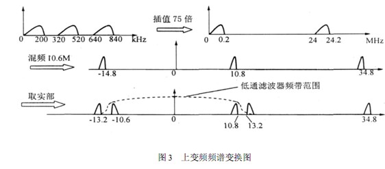 為描述直觀方便,本文仿真中擬定一組數(shù)據(jù)作為參考值。假定輸入的基帶信號帶寬為 200kHz ,采樣率為320kHz ,內(nèi)插系數(shù)定為 75 倍 ,則插值濾波后的采樣率變?yōu)?/span> 24MHz , 設定正交載頻頻率為10. 6MHz。這組參考值下的頻譜變換圖如圖3所示。根據(jù)系統(tǒng)運算量估計和成本預算 ,最終選用CYCLONE II系列 EP2C8T144芯片實現(xiàn)。