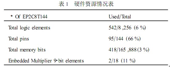 以上模塊中 ,NCO ,時鐘生成模塊和數(shù)據(jù)精度控制模塊由VHDL 硬件描述語言編程實現(xiàn) ,其他模塊采用QUARTUS提供的各功能子模塊搭建完成。經(jīng)QUARTUS軟件編譯后 ,使用計算機仿真可得各數(shù)據(jù)的矢量波形圖和 RTL 級結(jié)構(gòu)圖。軟件綜合分析 ,會自動總結(jié)出的硬件資源使用情況。從表 1 可見 ,選用 EP2C8T144芯片是比較合適的。