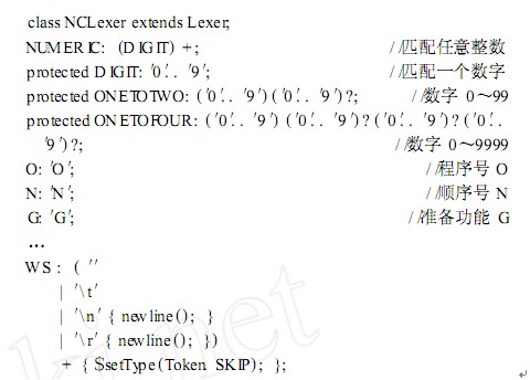 ANT LR中 的 規(guī) 則 分 為 公 有 型 ( public ) 和 保 護(hù) 型(p r otected)兩類(lèi)。上述 D IGIT規(guī)則定義了一個(gè)數(shù)字 ,其為p r otected類(lèi)型 ,該規(guī)則不能單獨(dú)使用 ,只能嵌套到其他規(guī)則中。該規(guī)則被 NUMER I C規(guī)則調(diào)用 ,定義任意整數(shù)。WS規(guī)則中的“ $setType ( Token . SKIP) ” 是代碼調(diào)用一個(gè) ANT LR的內(nèi)置函數(shù) ,告訴詞法分析器 ,前面定義的這四種字符都一律跳過(guò)。完成該文件后 ,運(yùn)行 ANT LR便可以生成相應(yīng)的詞法分析器 ,然后通過(guò)以下的循環(huán)可以依次將 NC文件的短語(yǔ)讀出來(lái)。