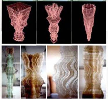 在前期的設(shè)計(jì)過(guò)程中,所有的工作基本都在程序的界面下進(jìn)行,而前后期的對(duì)接過(guò)程中, 也都是通過(guò)計(jì)算機(jī)程序?qū)С鏊枰臄?shù)據(jù),直接進(jìn)行數(shù)控加工。前期數(shù)據(jù)的分析提取是一個(gè)客觀的過(guò)程。 而后期規(guī)則的制定、最終形體的選擇則是一個(gè)主觀的過(guò)程,取決于設(shè)計(jì)師的個(gè)人審美情趣。在這次探索中, 最大限度地實(shí)現(xiàn)了從設(shè)計(jì)到加工的數(shù)字化,設(shè)計(jì)師關(guān)注的重點(diǎn)也從最終形態(tài)的控制轉(zhuǎn)移到對(duì)工作過(guò)程的控制,是一次成功的生成設(shè)計(jì)與數(shù)控加工實(shí)踐。