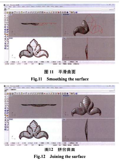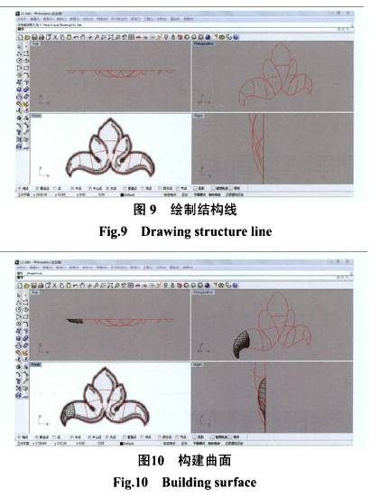 R h i n o 3D 建模的詳細(xì)過程, 首先搜集合適的素材,搜集方式同上, 通過犀牛N U R B S曲面工具建模, 首先利用曲線工具繪制結(jié)構(gòu)線, 通過調(diào)節(jié)控制點(diǎn)和曲線擬合工具重建曲線, 提高曲線的精度與連續(xù)度川(圖9 ) "接著使用補(bǔ)面工具在之前建立的結(jié)構(gòu)線的基礎(chǔ)上構(gòu)建曲面, 繪制曲面時(shí)注意控制相鄰曲面的連續(xù)程度 (圖10 ) "