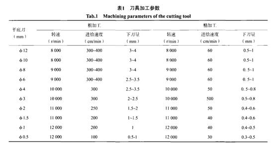 已選用刀具的幾何參數(shù)要進(jìn)人刀具資料庫 ,以備后用 "選好刀后, 開始確定刀具的加工方式在C A D / C A M 中根據(jù)加工路徑和工藝調(diào)用刀具庫中刀具 , 選擇加工路徑和加工方式 , 并確定其加工方向 !進(jìn) (出 ) 刀方式 !刀具轉(zhuǎn)速 !加工速度 !加工次數(shù)等參數(shù), 試驗(yàn)加工參數(shù)如表1所示 "模型模擬出三維動(dòng)態(tài)的仿真實(shí)的加工全過程, 觀察數(shù)控機(jī)床對(duì)工件的加工是否滿足要求, 如最大加工尺寸或最小加工半徑等 ; 并進(jìn)行檢驗(yàn) !評(píng)價(jià)產(chǎn)品的可制造性 , 通過對(duì)其設(shè)計(jì)不足的地方進(jìn)行修改 , 從而就能更加有效地 !經(jīng)濟(jì)地 !柔性地 !即時(shí)地組織生產(chǎn) ! 完成刀具路徑的 設(shè)置后 , 用C A D / C A M 自動(dòng)輸出N C碼 , 再把數(shù)控N C碼輸人數(shù)控加工機(jī)床, 安裝刀具 ! 歸零 ! 找工作坐標(biāo) "然后開始自動(dòng)加工!.2 "