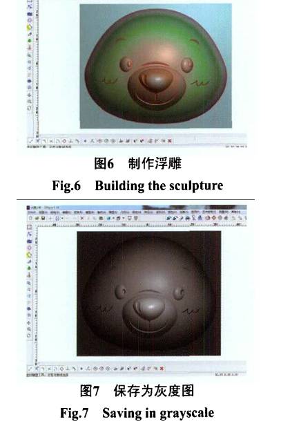 為防止誤操作丟失顏 色, 可將顏色存為位圖, 完成后通過區(qū)域浮雕和顏色浮雕功能將封閉的二維圖形生成三維曲面, 并利用多種拼合方式組合到浮雕元素上 (圖6 ) "全部完成后, 將模型轉(zhuǎn)換成灰度圖以便于下次加載使用 (圖7 ) "最后使用轉(zhuǎn)換器將EN G 格式文件轉(zhuǎn)換成精雕機(jī)識(shí)別的N C代碼 "