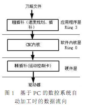數控機床最重要的工作是自動加工 在開放式數控系統中 執行自動加工功能時 數據處理的流程一般如圖 1一個編制好的加工文件 首先經過 PC 用戶態程序的處理 完成所謂粗插補的工作 然后控制系統再把粗插補的結果通過 CNC 內核 俗稱驅動 傳遞給運動控制卡 讓控制卡完成精插補的工作 實際中 在 CNC 內核層會完成更多的 實時性相對高的工作 比如端口掃描 為了討論方便 忽略這些內容