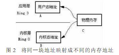 圖 2 中 物理內存 C 被分別映射成用戶地址空間的 A 和內核地址空間的 B內核模式程序從 B 處開始讀取數據 用戶程序從 A 處開始寫入數據