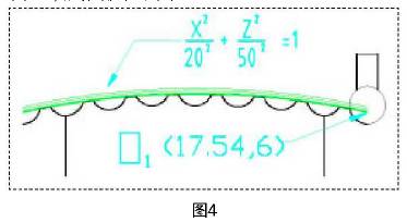 通過繪圖軟件CAD可以方便標出小圓1圓心坐標02 (24. 0, 19. 02),小圓1到9起始和終止角度的變化范圍在[25, 155]之間,(比賽的時候不需要標出小圓的起始和終止角,直接取[0,180]).橢圓曲線的起始角a和終止角R為:a二arccos (24/51. 5) =62. 2 0 R =180- a =117. 7 0
