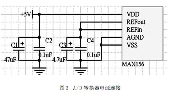 內部的2.5V 基準源輸出端(REFOUT)有必要經過1個4.7μF的電解電容和1個0.1μF 的瓷片電容旁路到模仿地,以確保器材的穩定性。VDD應經過1個47μF的電解電容和1個0.1μF的瓷片電容接到模仿地(圖3)。