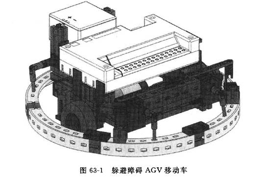 躲避障礙AGV移動車見圖63-1,能夠在前方遇到障礙時自動躲避并改變前進方向。躲避障礙AGV移動車由行走機構、障礙檢測裝置、智能接口板和電源組成。該AGV移動車使用下列輸人輸出設備:2個電動機,用于控制移動車左右車輪的運轉,控制移動車的行走;2個按鈕開關與凸輪配合作為旋轉編碼器使用產生脈沖信號,分別控制所對應左右車輪轉速;在移動車左前方、右前方和正后方裝有限位開關,用于檢測障礙物的方向,并發出信號。行走機構由兩個主動輪和一個無動力的輔助輪組成,均安裝在車架上。電源和智能接口板安裝在車架上部。