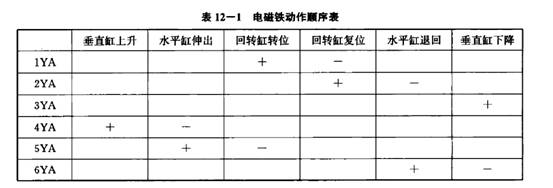 三個氣缸均有三位四通雙電控換向閥1, 2, 7和單向節流閥3, 4, 5, 6組成換向、調速回路。各氣缸的行程位置均有電氣行程開關進行控制。表12-1為該機械手在工作循環中各電磁鐵的動作順序表。