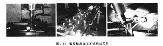 數(shù)控銑床的加工具有適應(yīng)性強(qiáng)、范圍廣的特點(diǎn)。其靈活性強(qiáng)的特點(diǎn)主要表現(xiàn)在利用一臺機(jī)床可以加工不同形狀的零件,如圖2-14所示。在數(shù)控銑床上加工的絕大多數(shù)零件屬于平面類零件,一般只需用數(shù)控銑床的兩坐標(biāo)聯(lián)動就可以完成加工。