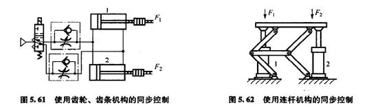 將兩只氣缸的活塞桿通過機(jī)械結(jié)構(gòu)連接在一起,從理論上可以實(shí)現(xiàn)最可靠的同步動(dòng)作。圖5. 61所示的同步裝置使用齒輪、齒條將兩只氣缸的活塞桿連接起來,使其同步動(dòng)作。圖5. 62所示為使用連桿機(jī)構(gòu)的氣缸同步裝置。對于機(jī)械連接同步控制,其缺點(diǎn)是機(jī)械誤差會(huì)影響同步精度,且兩只氣缸的設(shè)置距離不能太大,機(jī)構(gòu)較復(fù)雜。