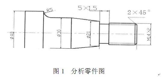 該零件是具有外螺紋的軸類零件,如圖 1 所示, 材料為 45號鋼,零件最大外徑是f40mm, 則毛坯可選 f45mm 的棒料,機床則選數控車床。