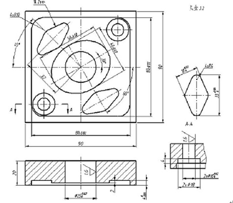 此圖中因為要加工的圓、 圓弧比較多,應該注意保證同軸度,內輪廓的平行度、 垂直度等, 還應該注意到加工過程中刀具的剛性問題, 兩個棱形因為不是對稱的, 所以還需要注意到棱形旋轉的角度等