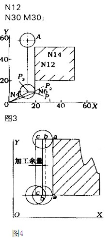 按此程序運行時,N6段和N12的指令是相同方向,因此從N4開始刀補啟動后,在點P1(20,9)上即作出了與N6段前進方向垂直向左的矢量,刀具中心也就向著該矢量終點移動。當執行N6段時,由于N8、N10是Z軸移動的原因而不知道下段的前進方向,此時刀具中心就移向在N6段終點P2(20,10)處所作出的矢量的終點P 3處,在點P3執行完N8、N10后,再移向交點A,此時的刀具軌跡如圖3所示就不會產生進刀超差了,這種方法中重要的是N6段指令的方向與N12段必須完全相同,移動量大小無關系(一般用1mm即可)。