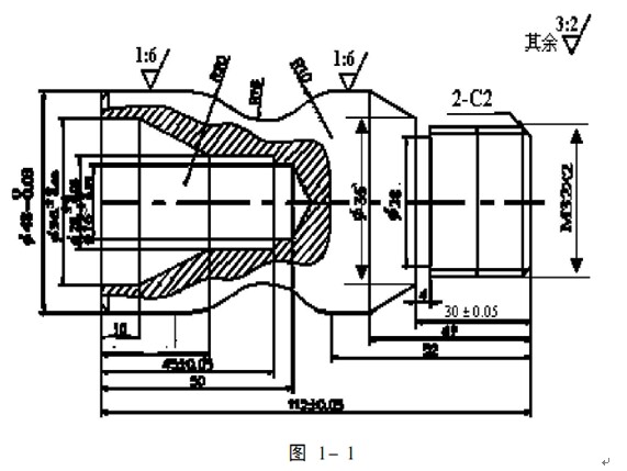 如圖 1- 1所示,零件主要包括凸凹圓弧、 圓柱面、 外螺紋、 退刀槽、 內(nèi)孔等。在加工帶錐體、 圓弧類零件以及配合件加工時(shí),采用刀具半徑補(bǔ)償編程,可以防止零件表面產(chǎn)生過切或欠切現(xiàn)象, 確保工件的尺寸和形狀精度。