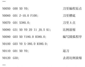 由于在應(yīng)用比例放縮編程時(shí), 刀具半徑是不會(huì)改變的, 所以不能應(yīng)用刀具半徑補(bǔ)償功能編程, 只能應(yīng)用刀具中心編程。